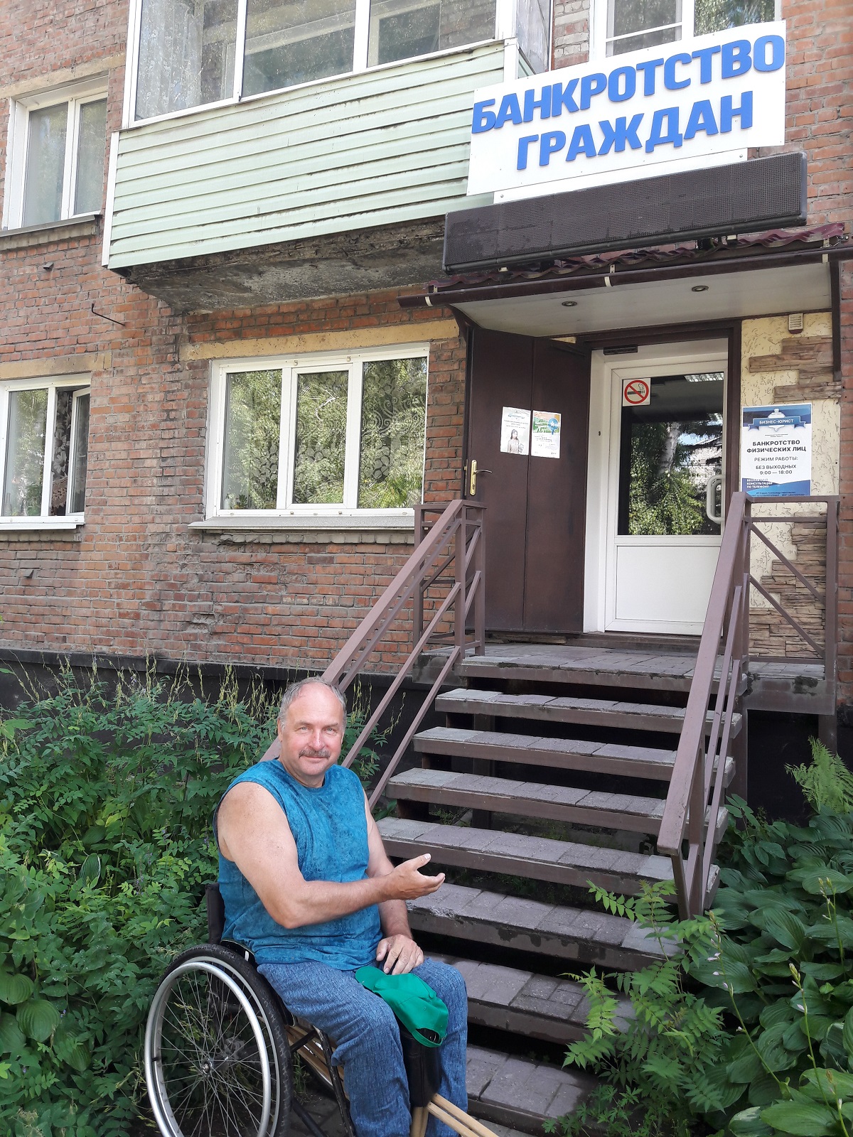 Во время прогулки по городу попалась на глаза организация с названием «Банкротство граждан» с режимом работы, как написано на вывеске, «без выходных». Но, видимо, банкротить людей с инвалидностью там не собираются: к входу ведет крутая лестница. И то правда – век бы туда не заходить!